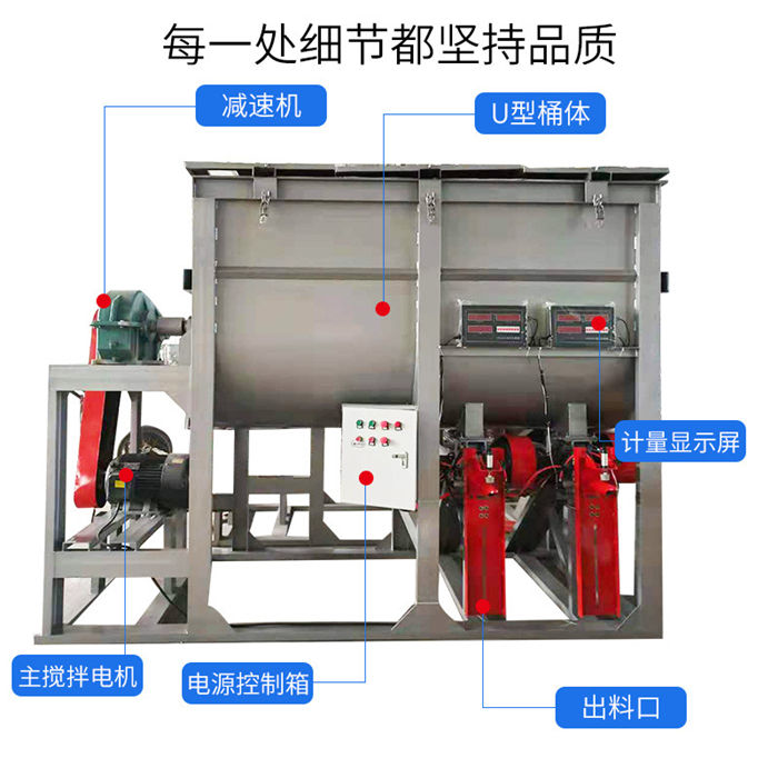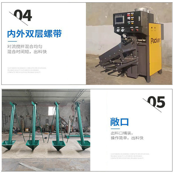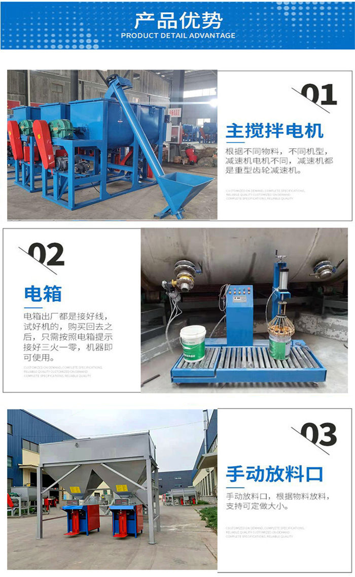該設(shè)備為全自動干粉砂漿攪拌機,整機四角加上料計量,適合多種物料混合的攪拌,設(shè)定好斤稱之后,物料由提升機上料,斤稱達(dá)到自動停止,然后接著上第二種物料,以此類推,計量準(zhǔn)確,省時省力;出料系統(tǒng)設(shè)計也是電腦計量裝置,無需人工二次稱重,閥口袋包裝,無需再次封口,出料速度快,4秒一袋,1人即可操作,省時省力;攪拌機機身為臥式U型筒體,內(nèi)部由內(nèi)外兩層螺帶交錯布置,攪拌均勻,混合速度快,5至8分鐘即可攪拌均勻,出料可根據(jù)不同物料的實際需求定做多個出料口。